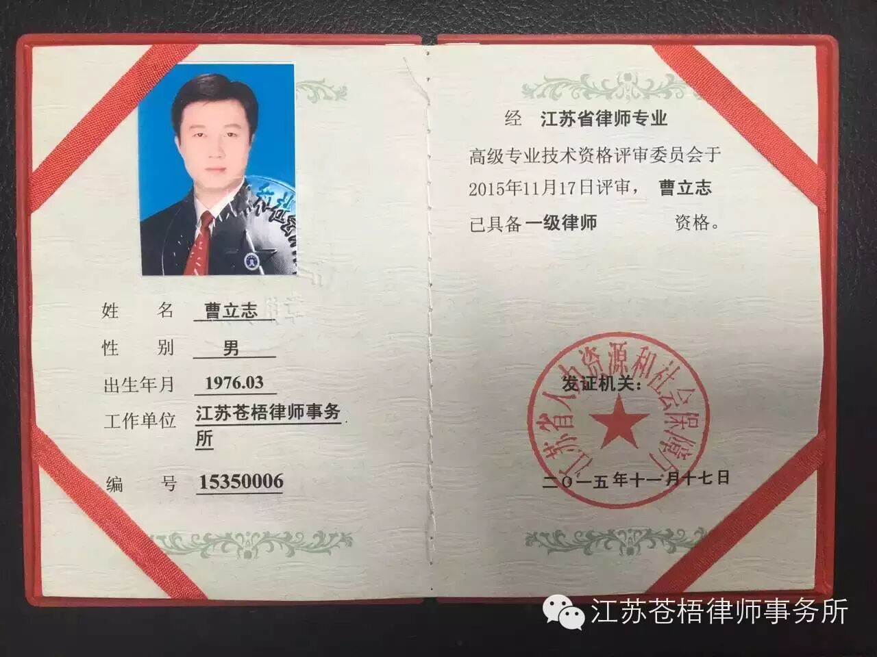 曹立志主任1997年通过全国律师资格考试,系当年全市律考状元,专职律师执业至今。执业十九年来,分别通过初级、中级、副高级职称评定,2015年11月在经过江苏省高级技术资格评审委员会对执业年限、学历、外语、计算机、奖惩记录、论文发表、业绩成果、案件卷宗等多方面进行综合评定,条件优秀、评定合格。成为全市最年轻的正高职称的一级律师。据悉,全市迄今为止,一级律师仅有五人。